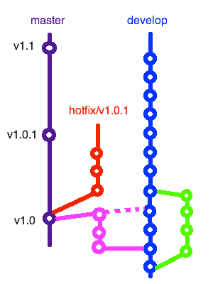 That’s the process of git-flow. Two immortal branches, three mortal branch species. master contains only tagged production releases, while develop is always ready for new functionality. Features come off develop and go back to develop. Releases move code from develop to master, with testing in between. Hotfixes branch off master and go back to master as a new release.