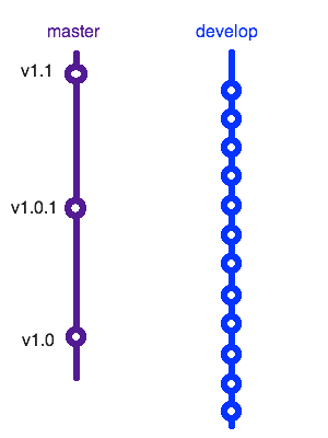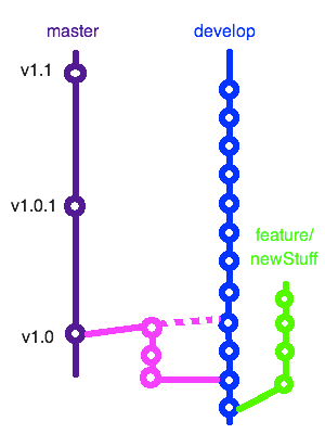 There are three species of branches that come and go. First, let’s take a look at how code gets from develop to master.