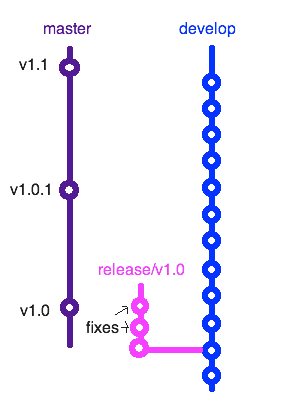 When testing is complete, finish the release. The release branch is merged into master (and develop, so the fixes get into the next version). Goodbye, release branch. Your commits will remain in our tree forever, but your name is no longer needed.