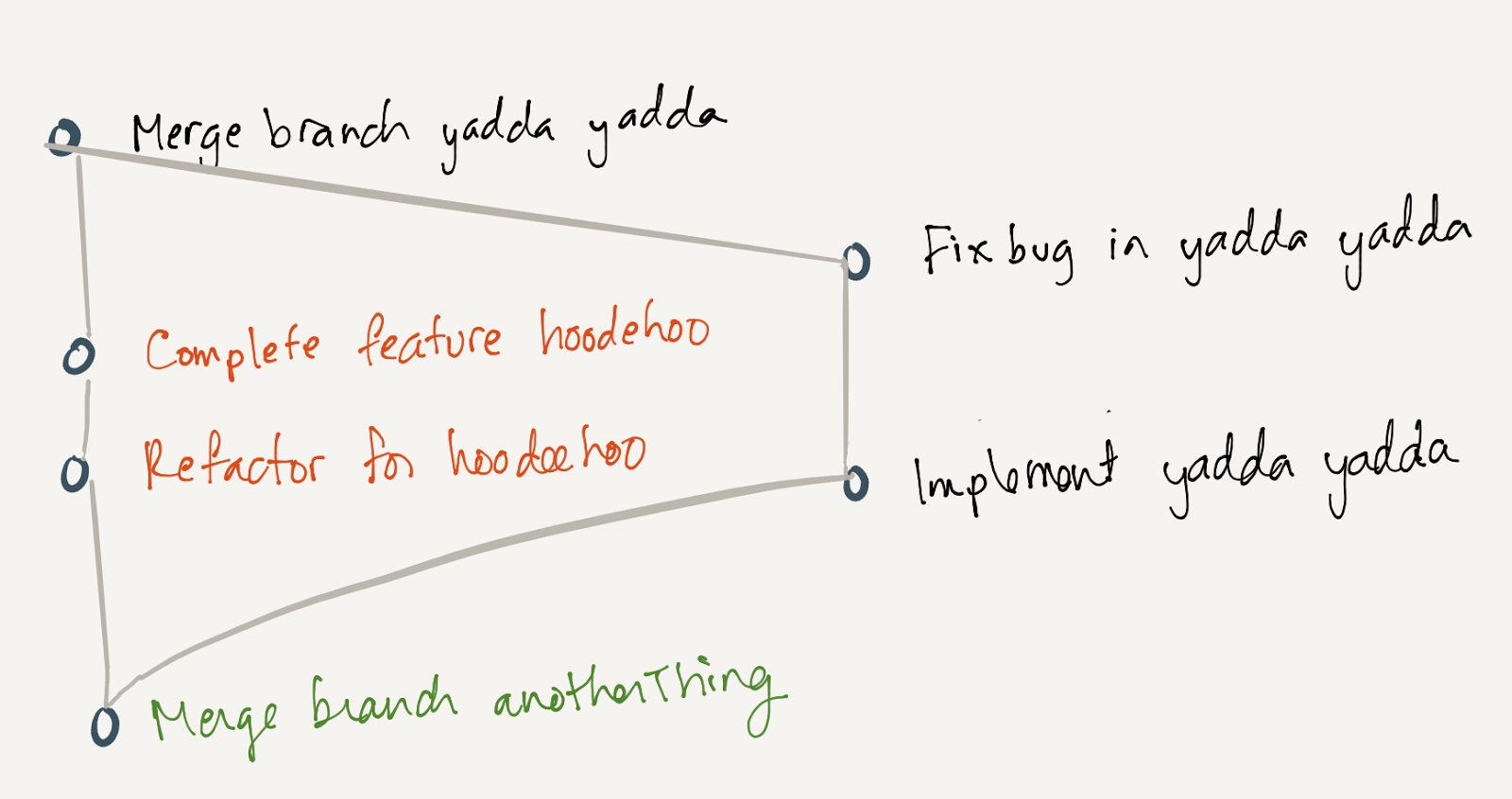But that’s not reality. Some commits happen before others: each commit I make is based on its parent, and every parent of that parent commit, transitively. So the parent happened before mine. Meanwhile, you might commit to a different branch. Whether my commit happened before yours is irrelevant. The merge commit brings them together; both my commit and yours happen before the merge commit, and after the parent commit. There’s no need for a total ordering here. The graph expresses that.